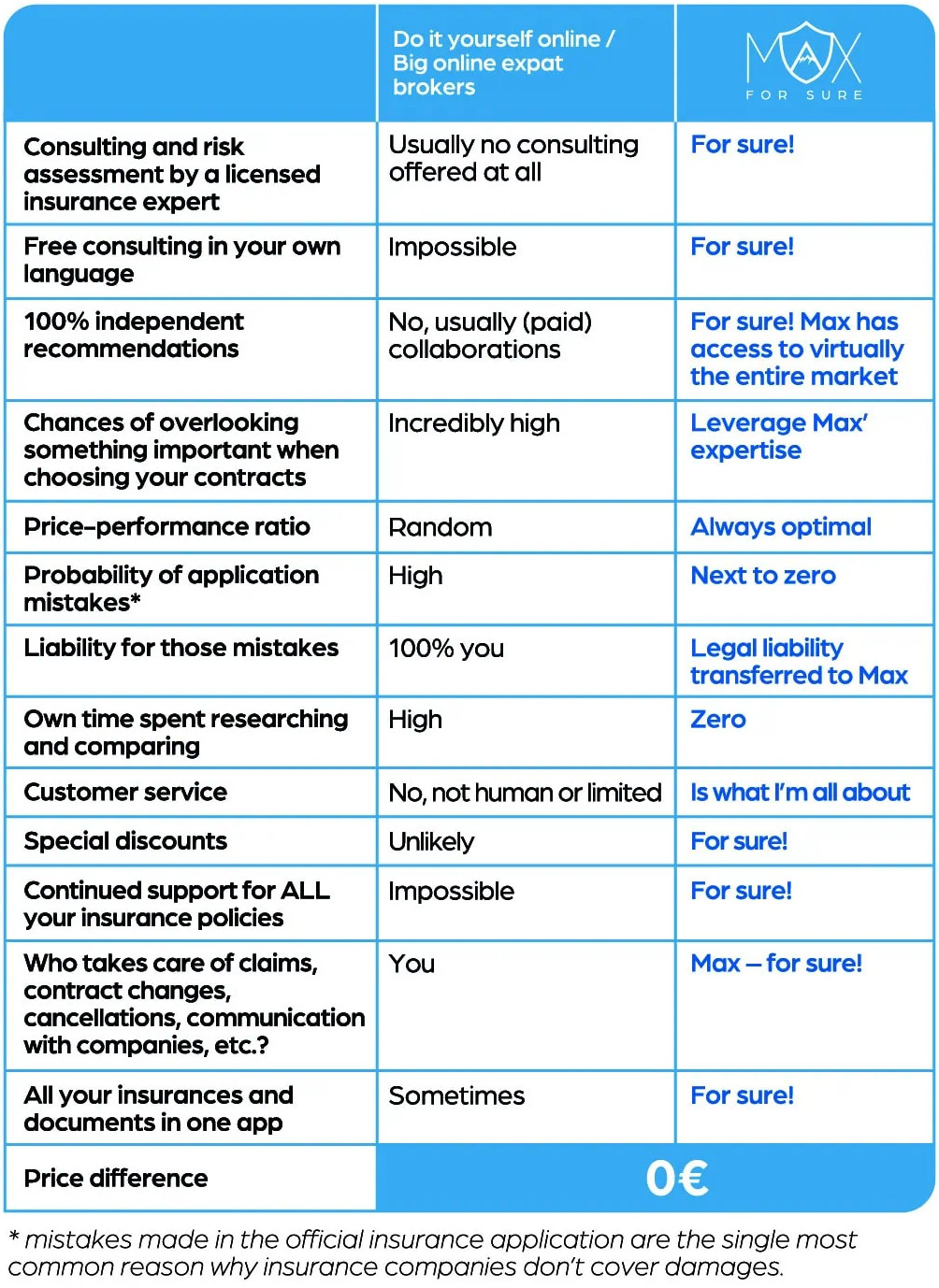 At no extra cost whatsoever, max for sure offers expats the unique possibility to get professional insurance advice in their own language. This way, Max’ expertise can be leveraged in order to
